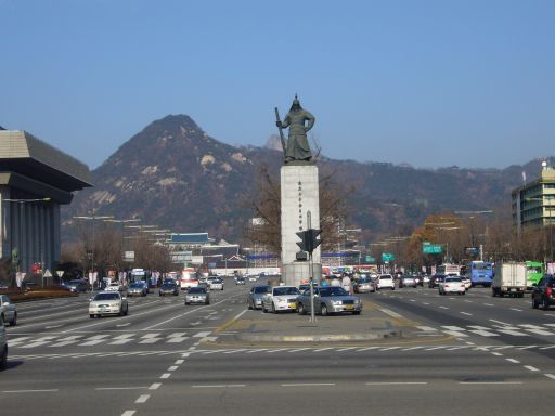 チュンジョンノ駅から市庁方向へ歩く。あ、高麗サムゲタンだ、サムゲタンしばらく食ってねぇなぁ、土俗村で食いてぇなぁ、などとブツブツ言いながら、徳寿宮の前を通り光化門方面へ。うわぁ遠くまできれいに見えるなぁ、と交差点の真ん中でパチリ。