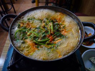 アグタン・・・8,000ウォン 店名:チャガルチシクタン 今回の旅行へ出かける日、24日のとうちゃんさんのブログに、一人前で出してくれるアグタンの店が出ていました。それがここです。だいたいの位置しか書いてなかったですが、見当は付いていました。きのうアルタンを食べて、一人前海鮮鍋にハマってしまったので、次はアグタンでいきたいなと。 アグチムは食べたことがありましたが、アグタンはもちろん初めて。アンコウの鍋はうちでもやりますが、まぁ日本式ですから。 うまかったです。赤いスープはいいですね。ごはんにはあまり箸をつけずに、まず鍋の具を食べてしまって、残ったスープの中にごはんを投入、汁メシにして食べました。こういう場合、よくポックンパプにしますが、あれ、私あまり好きではないんです。特に鍋底なんかに焦げて残るのがどうにも気に入らない。 すっかりきれいに食べたのでした。 |