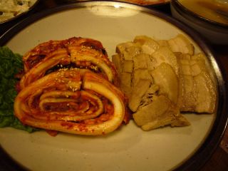 ナクチピビンパプ・・・5,000ウォン 店名:マポナル(支店) タットリタン、ポッサムとともに、ナクチピビンパプもうまいと聞いていたので行ってみました。初めて食べるものでしたが、うまかったです。辛い味付けであることは知っていましたが、熱いものだとは思いませんでした。ぶつ切りのたこがもう少し細切れだと、かき混ぜやすく食べやすいと思いました。でも、個人的にはふつうのピビンパプのほうがいいです(笑。 |