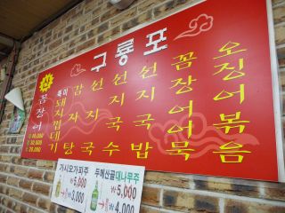 先月チャガルチ界わいを歩いたとき、これの文字(과메기)だったか写真だったかを見たような気がしたが・・・と戻って、再び探し始めた。魚の街だからすぐに見つかるだろうと探すのだが、意外にも、ない。がしばらく歩いていて、やっと1軒、ポジャンマチャか店なのかわからないようなところに、クァメギの写真(ポスター)が貼ってあるのを見つけた。しかも本場ポハン(浦項)のクリョンポ(九龍浦)とある。妙にそそる・・・