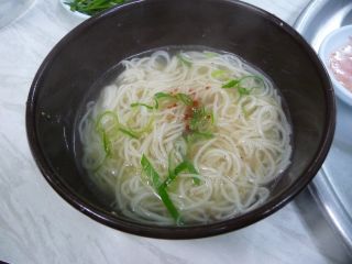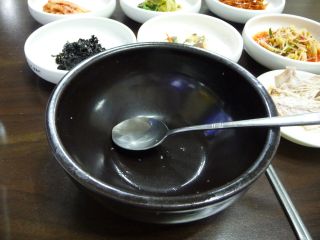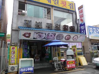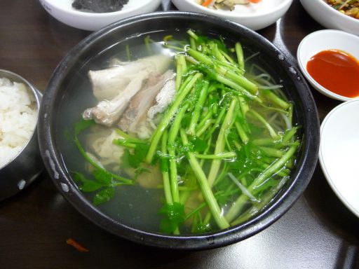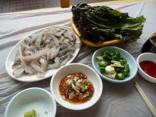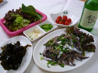大小2尾のトダリの、それぞれ頭と尾を取り払い、ポリ袋に入れ、「あとは上でね」と、主人はそのポリ袋をアジュマに渡し、私はアジュマについて3階に上がって行った。このアジュマの店がチョジャンチプというやつなんだな。野菜やチョジャンなどを用意して、場合によってはメウンタンなども作ってそこで食べさせるという、あれ。初めての経験^^;基本(野菜と調味料)が3,000ウォン。ソジュはいくら?と尋ねると、ちょっと考えて4本指を立てた(4,000ウォン)。普通の飲食店では3,000ウォン。ちょっと不審に思ったのでソジュは注文せず^^;
