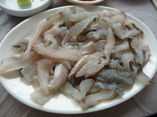 出てきたポム・トダリ・フェ。見にくいかもしれないが、左のほうがセゴシ。食べてみて、プリプリのいかにも活魚の刺身の食感があり、おいしい。セゴシは、いくら小さいからといっても、カレイの骨だから気になるだろうなと思っていたが、意外にも気にならなかった。というか、この骨をかみ締めるのがクセになってしまった^^;恐るべし、セゴシ。おいしく完食したのだった。