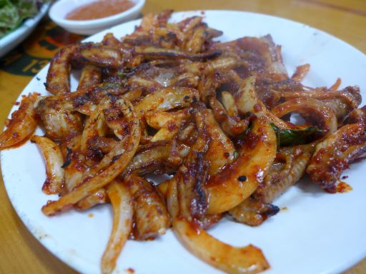 | さほど空腹ではないので、味見程度のつもりで入ったのだが、ひと口食べて、これは全部食うなと思ったのだったw ここのコムジャンオは、生きたものでもないし、韓国産でもない(アメリカ産)が、そんなことは重要ではない。うまければいいのだ。 |