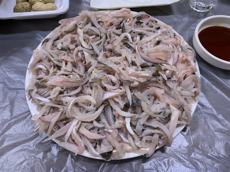 17時半、ミョンジジャントフェッチプ着。ウンオあった?ネー、でウンオフェ。解凍ものでない生で、見るからにうまそう!生でありながら脂感もあり、久しぶりに満点のウンオフェであった(ソジュ・チョジャン代込3万ウォン)。ここのアジュマは日本語が少しできるのがわかり、気になっていたサジャンニムのお母さんのことを聞いてみると、やはり2年前に病気で亡くなったとのこと。そして「あす友人と来るのでこれをふたつ用意しておいて」をサジャンニムに伝えてもらい、退出。 |
