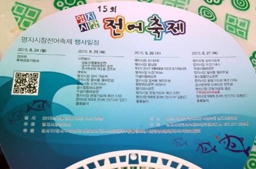ハダン駅前からマウルバスでミョンジ市場へ。バス停前のテント村は閑散としている。市場の方に行ってみると、カラオケ大会の最中、客は少なめ。無料試食会はどうなってんだ?会場テント内に行事予定の入った団扇が置いてあった。本日の予定をグーグル翻訳にかけてみたところ、