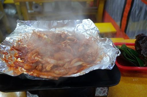 近くに食事できる店はいろいろあるが、どこに入ってよいのか決められない。意を決し、サウナ前のテジカルビの店に入る。ヤンニョムテジカルビ3人前21000wプラスソジュ3000w。味はまあ、こんなもんかな。