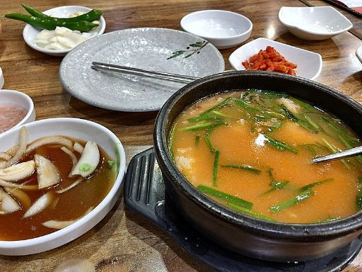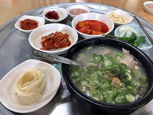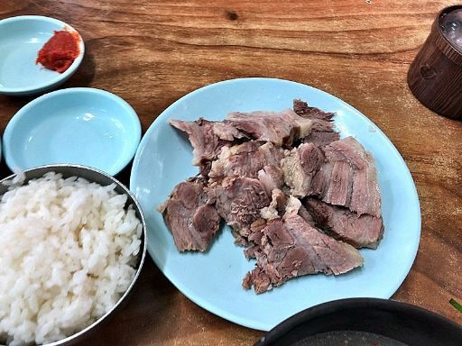 昼食はもちろん東部食肉食堂。すぐに見つかる。ここも昨日の店同様、「TVに出ました」の類は一切ない。客もほぼいっぱい。迷った挙句、やはりテジクッパ(7,000w)+ソジュ(3,000w)を注文。澄んだスープの最初の香りがまるでソルロンタンのよう。これが牛スープテジクッパか。何も入れずに一口目、うまい。いける。セウジョを少し入れて味を締める。スープがとてもうまい。ついてきたそうめんを投入し、最初に麺をいただく。心配していた肉は脂身が少なく、薄め。特にうまいとは思えないがなんとかいただける。タテギを投入しスープに赤みをつけてみる。最初は牛のスープっぽかったのが、いつのまにか豚のスープになっている。ハルメクッパのスープに似た味だ。メニューにあった「ソコムタン(7,000w)」を食べて見たい気がふつふつと湧いてくるが、腹具合を考えてやめておく。満足して、バス停に。