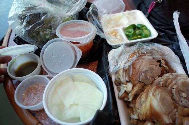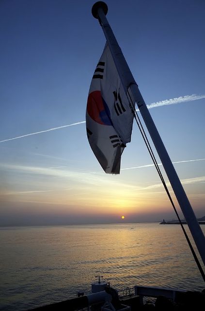 地下鉄で西面へ。カフェ051でタルギジュース(3,500w)をテイクアウト、バス(17)でプサンジン駅へ。夕食はヨンシミワンチョッパルでチョッパル小をポジャン(15,000w)。地下鉄で中央駅に行き、フェリーターミナルへ(3等 51,500w)。6時より乗船。乗船後3階にある外が見える休憩用テーブルを一つ確保し、ポジャンしたチョッパルをいただく(写真2)。うん、うまい。プルプルコラーゲン部分が固まってしまうのは仕方ないか。そのままネットをして過ごす。