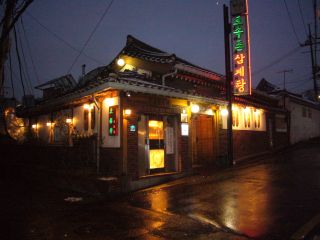 うわっ、ほぼ満席。ほとんどが鍋物を食っているようだ。壁に貼ってあるメニューから、トリ系の鍋料理の店であることがわかった。期待してタッコムタンを注文した(4,000ウォン)が、ほどなくして運ばれてきたタッコムタンを見て・・・失望した。2、3口スープをすすり鶏肉を食って、その失望が確信に変わった。悪いほうの予想が当たってしまった。何の変哲もないスープに、煮た(「煮込んだ」ではない)鶏肉を割いて入れただけの、何ともないタン(湯)料理だった。特に鶏肉は、柔らかなサムゲタンを食った後だけに、余計にその硬さなどいい加減なところが気になった。パンチャンのにんにくの茎キムチがうまかったので、それをおかずにして白飯を食い、店を出た・・・