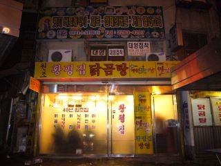 忠武路周辺も結構な数の飲食店がある。期待して歩き回るが・・・ない。いや、チキン屋はある。が、あの店のようなチキンがないのだ。そしてホテルPJまで来ると、向かいにタッコムタンのメニューがある大きな店があった。外から覗くと結構混んでるみたいだった(21時)。タッコムタン、ちょっと気になっていた料理だったので、時間的にもいいし、思い切って入ってみた。