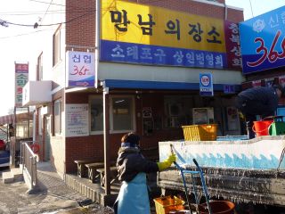 あっ、壁に据付型の公衆電話があるぞ・・・それだけか?・・・あっ、ガスボンベがある。でも写真のより小さいなぁ・・・でもここがそうだとしたら、看板のフェッチプの횟の赤い字が見えるはず・・・ってあるぞ!・・・おいおいここか!?・・・でも、そもそもここは何なんだ?・・・あ、こっちに看板があるわ・・・っと、만남의장소(待ち合わせ場所)っとな?えぇ!?