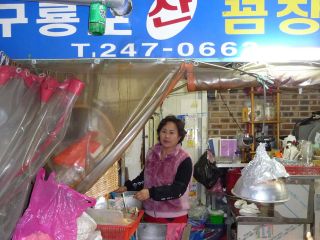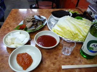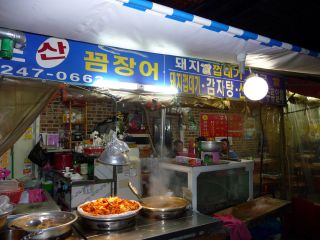 宿に荷物を置いて、さぁ1食目。ヘリムのアジュマに、「このあたりでクァメギの食べられる店ない?」と聞くと、「クァメギ!?そんなの韓国人でもあまり食べないよ。さぁあるかねぇ。チョッパルコルモクに行けばいろんな店があるから、そこ行って聞いてみては?」みたいなことを言われた。クァメギがチョッパルコルモクっておかしいだろ、と思いながらも行ってみたが、魚の店は確かにあったが、扱ってるようには見えなかった・・・