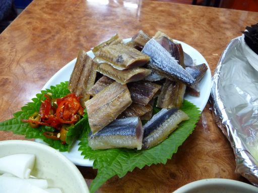 クァメギ・・・パッと見、サンマの干物かあるいは身欠けニシンのようなもので、ファンテのように凍結解凍乾燥を繰り返してできた食いもんだ(ファンテはスケトウタラ)。このクァメギを、KBSの「韓国の美」という番組で昨年見て、うまそうだったので興味を持っていた。先月プサンに来たときはさほどでもなかったのだが、今回は日本を発つ直前に思い出し、食ってみたいという思いが膨らんでいた。