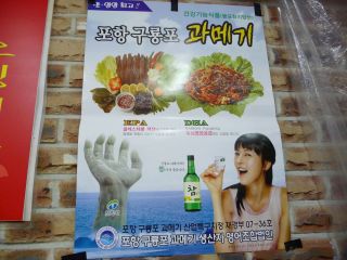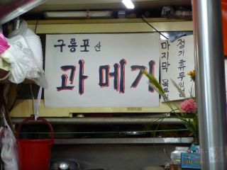 先月チャガルチ界わいを歩いたとき、これの文字(과메기)だったか写真だったかを見たような気がしたが・・・と戻って、再び探し始めた。魚の街だからすぐに見つかるだろうと探すのだが、意外にも、ない。がしばらく歩いていて、やっと1軒、ポジャンマチャか店なのかわからないようなところに、クァメギの写真(ポスター)が貼ってあるのを見つけた。しかも本場ポハン(浦項)のクリョンポ(九龍浦)とある。妙にそそる・・・