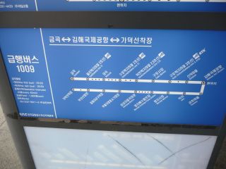 プサン最初の食事、テジクッパにするかチョノフェにするか。さんざん迷っていたが、着陸直前にチョノフェに決めていて、空港を出ると、1009番バスの停留所を探した。1009番がミョンジ市場に止ると調査済だったので。