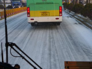 この日、プサンもそうだったのだが、ポハンも夜中に雪が降った。で、バスに乗ってプサンターミナルを出て、ポハン方面に近づくにつれ、その影響が出始めた。道路の一部が通行止めになったらしく、いつも通らない道を走っている。滑りそうな路面。渋滞もしてきた。ん~これはイヤな予感。 |