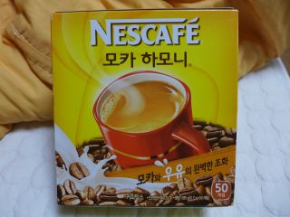 | 買いたかったのは甘いコーヒー。韓国の、あの甘いコーヒーがたまに飲みたくなるので。ヘリムモーテルにもこれ(マイルドモカ)が置かれているので、どこで買うの?と聞いてみたところ、いつもコストコで買っているとのこと。ネッスルのものなのだが、コストコ仕様なのかメーカーホームページにも載っていない。どうやらそれに近い商品が「モカハーモニー」らしいのだが、新商品(らしい)の「シンソナン