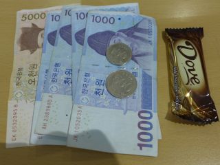 細かいお金(千ウォン札・500ウォン硬貨)がないことに気付き、コンビニで小さなチョコレート(400ウォン)を買い、1万ウォン札で支払い。いつも細かいのは多めにしていたのだが、今回どういうわけか、日本の感覚で小さいのから使ってしまっていた。意外に小さいのが必要なときがあるので用意しておかないと。なかなかうまいチョコだったw |