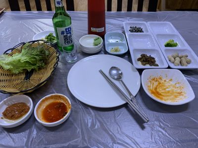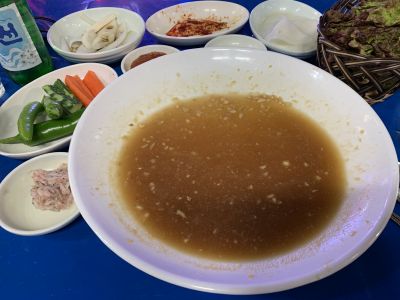 17時半、ミョンジジャントフェッチプ着。ウンオあった?ネー、でウンオフェ。解凍ものでない生で、見るからにうまそう!生でありながら脂感もあり、久しぶりに満点のウンオフェであった(ソジュ・チョジャン代込3万ウォン)。ここのアジュマは日本語が少しできるのがわかり、気になっていたサジャンニムのお母さんのことを聞いてみると、やはり2年前に病気で亡くなったとのこと。そして「あす友人と来るのでこれをふたつ用意しておいて」をサジャンニムに伝えてもらい、退出。 |