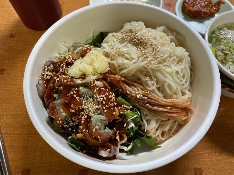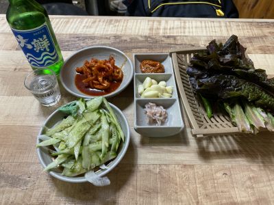 夕食はチョッパルのつもり。できればヨンシミで普通のを食べたい。でまずはチャンニョン食堂の営業確認→やっている、OK。ハニャンは・・・店が変わってる!牛系の店に。あぁ・・・とヨンシミへ。ポジャン待ち客らしきがあって、店を覗くと空きテーブルあり。やった!と顔を出すと、女主人が「おっ」と。でもすぐ表情が変わり、何か言ってる。ん?と戸惑っていると、「コギガオプソ」と。売り切れかよ!アイグッ!ハニャンもやってないし、シンチョリャンか・・・いやダメ元でとヤンジョンの本店へ。