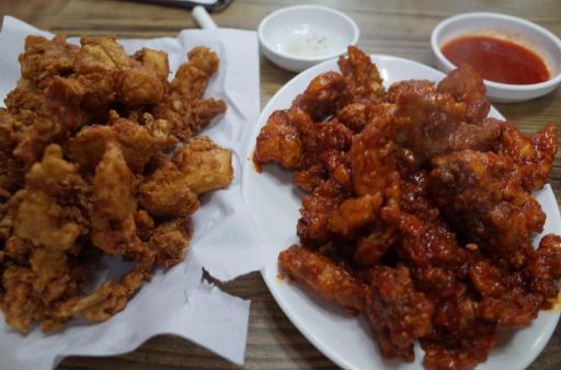 店員が、英語でメニューの説明をしてくれる。普通の唐揚げと、甘辛いのと2種類。両方入ったハーフ&ハーフ(17,000w)と生ビール(3000w)を注文。他のテーブルの品を見ていると、量がすごい。一目見て、「無理」と思う。2,3人のグループだと、食べきれてない。自分も、案の定、半分ほどでギブアップ。味は、特にたいしたことなかったかな。さすがに唐揚げ責めは少々きつく、パジョン食べる気はなくなりました。少し興味を引かれた屋台がある忠武洞夜明け市場から海沿いにまわって、ハナロマートで飲み物を買って宿に戻る。 |