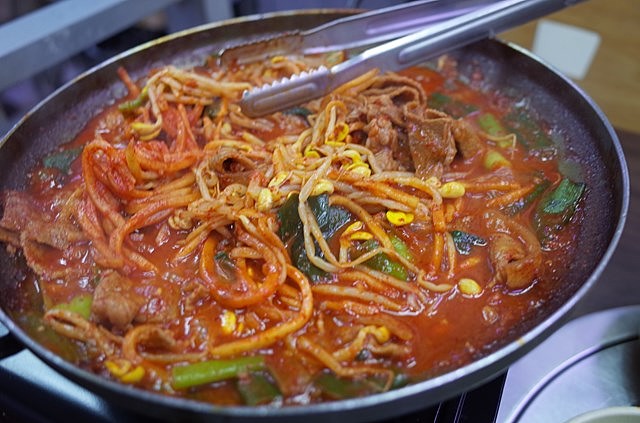 5時過ぎ起床、朝風呂を浴び、6時前にサウナを出る。小雨が降っている。タクシーで空港まで。(4,100w) 定刻通り、出発1時間かからずに大邱へ。バスでもよりの地下鉄へ行き、中央駅まで。ハニル食堂でタロクッパ(8,000w)。「ソンジはちょっと」といったら別の椀に入れて出してくれた。朝から少々ヘビーだったが、うまかったです。スタバで休憩後繁華街を歩く。西門市場まで歩き、市場を探索。ここはなかなか楽しめる。市場の地下に食い物屋が集まっているところがあるんですが、そこのフェトッパプがなかなかうまそうだった。またチャレンジしてみたい。2号線、3号線と乗り換え、半月堂へ。昼は大邱10味の一つ、焼きうどんだ。正直、焼きうどん、あまり気が進まなかったんですが、大邱10味の一つである以上、仕方なくチャレンジした次第でした。しかし、いやぁ、さすが、大邱10味。見た目と違い、すげーうまい。全然辛くないし、甘酸っぱくもない。香ばしく、まさに焼うどんの味。意外にうまくて驚きだった。(中和飯店 やきうどん 9,000w ビール4,000w)
