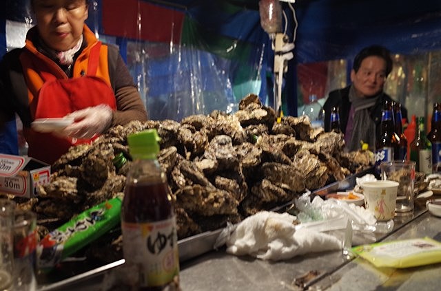 地下鉄でナンポドンまで戻る。ロッテを回って、光復路に行ってみるとすごい人。さすがにクリスマスだ。クルグイが食べたくて、クルグイ専門の屋台にいってみるも客でいっぱい。様子を伺っていると、席が空いた。すぐさま入る。おばちゃんに勧められ、生と焼きを半々ソジュとともにいただく。他の多くの店でもカキは置いてあったが、やはり専門店がいい。カキを堪能した後は、忠武路まで行き、マッコリでケランマリをいただく。ここで持ってきた携帯用袋入りの醤油が最後に活躍する。玉子焼きにはやっぱり醤油ですよね。最後の晩餐を十分に堪能し、宿に戻る。 |