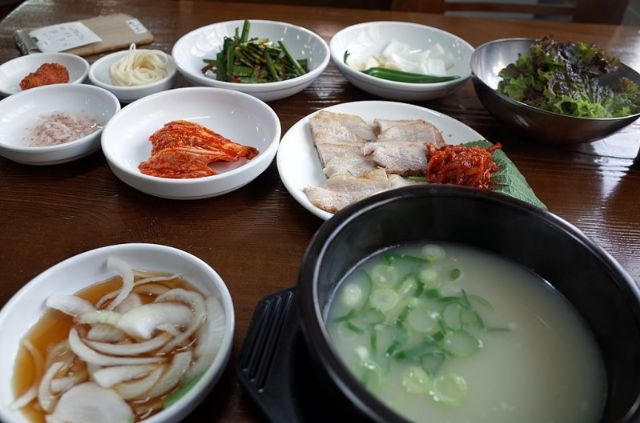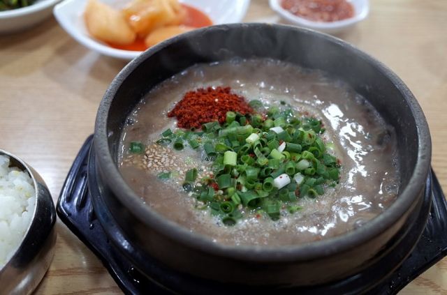 朝風呂後出発。半袖であったが、思ったほど寒くなかった。朝食は再び、ウジンヘジャンククで、サゴルヘジャンクク(9,000w)。見た目赤く辛そうだが、それほどでもなかった。牛肉、ソンジ、モヤシ等が入ってた。マヌルが別皿でついてきたので入れていただきました。次回は他の人が食べていてうまそうだったモムグク(ほんとはこれを頼んだつもりでした)を試したい。