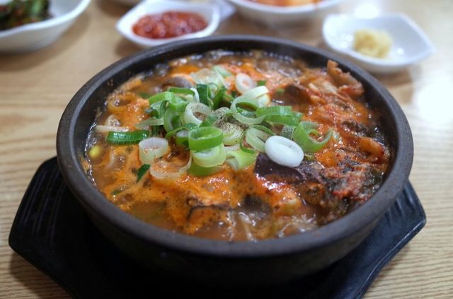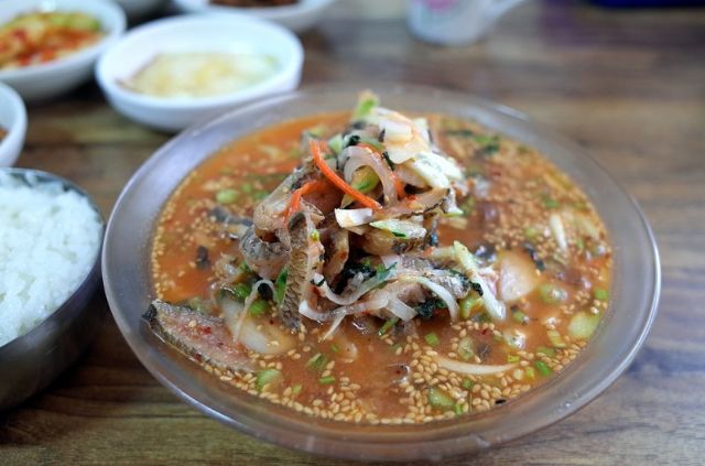 回っている際、チャリムレがおいしそうな店はないかなと探していましたが、見つからず、城山に戻ったところで港の食堂の看板に「チャリムレ」の文字を見つけたので、その店で食べてみました。地元の小さな激シブなお店(トゥンチシクタン)で、客は他におらず、おばあさんが一人でやっているお店でした。チャリムレ(13,000w)は、そうめんの器のようなガラス製の椀に入って出てきました。チャリはセコシで骨が感じられ、味はなんとも微妙な感じの味でした。おそらくは店により、特にスープの味が違うことでしょうから、また違う店でも試してみる必要があると思いました。(最初から評判の店に行けばよかったんですが。。。)
