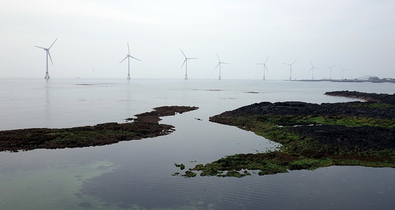 食後は西帰浦へ。市場内で名物みたいなミカンジュース(3,000w)を飲む。再び西進。西海岸の海に並ぶ風力発電の風車を見に行く。前回は雨の中見たが、今回は天気も良く、ゆっくり堪能(新昌風車海岸道路)する。日の入りも見たかったが、まだ時間がずいぶんありそうで、そのまま海岸沿いを南に向かった。