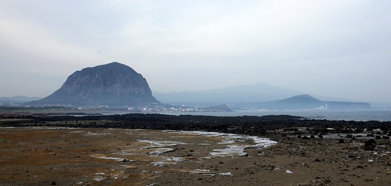 途中にあった大静の港には良さそうな食堂が並んでいる。良さそうなところだ。マラド行きの港を経て松岳山沿いの景色を堪能しながら、山房山の南へ。山房山は南から見るのが一番(写真2)。すごい迫力だ。まだ日が沈み切らないうちに今晩の宿、山房山炭酸温泉に到着。近くのトットンでいつものフッテジ+ソジュ(22,000w)を食べ、温泉(14,000w)に。冷泉だが相変わらずいい炭酸泉だ。人も少なめでのんびり過ごせ増せた。 |